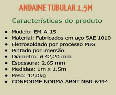 Andaime Tubular 1,5m EMIT, material fabricado em aço SAE 1010, maior qualidade e Durabilidade. O Andaime tubular EMIT é leve e fácil montagem.